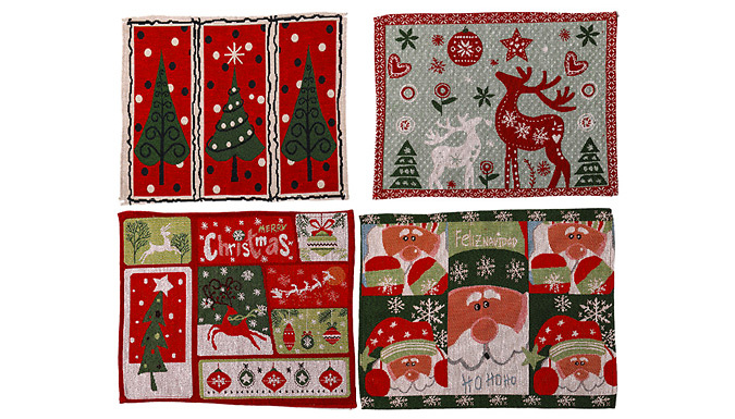 Cover your table in Christmas charm with this 4-Piece Christmas Family Table Placemat Set This Christmas playmat set brings loads of holiday charm and sets the atmosphere for your dinner Prevents scratches and scrapes on your kitchen table while adding loads of style Ideal for dining rooms, the office, restaurants, bars etc… Each set includes 4 placemats with Santa Claus, Tree, Snowman, and deer designs Dimensions: 33cm x 47cm Made from 40% cotton and 60% chemical fiber Spread the festive joy and save % with this 4-Piece Christmas Family Table Placemat Set