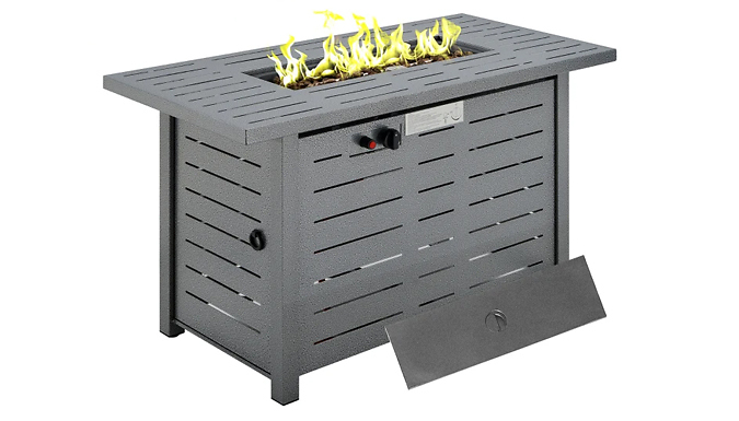 This Outsunny Gas Fire Pit Table is sure to make you the ultimate BBQ host. Enjoy a nice dinner outside at the table then remove the cover to transform it into a fire pit for dessert The stainless steel burners provide a smoke free burn so you can sit around the table comfortably A built in ignition system starts and adjusts the flame easily making this a worry-free fire pit A propane tank can be easily installed into the base of the table and is hidden by a side door This firepit table comes with a cover to protect it whilst not in use Also included is the regulator and hose for the gas link up Dimensions: 107cm (L) x 51cm (D) x 63cm (H) Save 22% on the Outsunny Gas Fire Pit Table today.