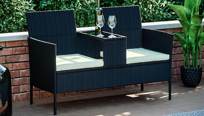 Do date night in style with the Vienna Love Seat with Centre Table Add a touch of class to your garden with this stylish outdoor loveseat Space saving with a table in the middle of the seat for all your drinks and snacks Chair: 83cm (H) x 130cm (W) x 60cm (D) Available in black, brown or grey Made of a durable Polyrattan, Galvanised Steel and Waterproof Polyester Fabric Buying Options: 139.99 pounds instead of 323.99 pounds for Black or Brown – save 57% 149.99 pounds instead of 323.99 pounds for Grey – save 54%